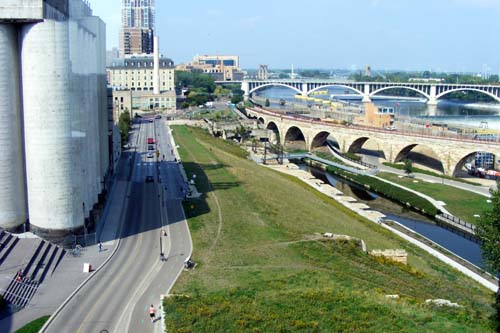 Vaizdas link Misisipės tiltų Minneapolyje.